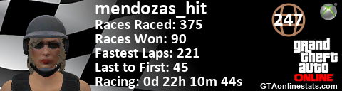 <a href="http://GTAonlinestats.com/showplayer/mendozas_hit"><img src="http://GTAonlinestats.com/racesignature/mendozas_hit/sig.png" alt="mendozas_hit" border="0" /></a>