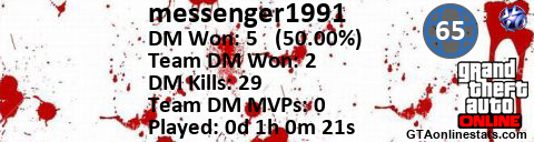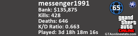 [URL=http://GTAonlinestats.com/showplayer/messenger1991][IMG]http://GTAonlinestats.com/signature/messenger1991/sig.png[/IMG][/URL]