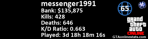 [URL=http://GTAonlinestats.com/showplayer/messenger1991][IMG]http://GTAonlinestats.com/dmsignature/messenger1991/sig.png[/IMG][/URL]