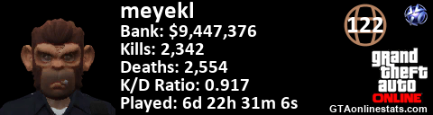 [URL=http://GTAonlinestats.com/showplayer/meyekl][IMG]http://GTAonlinestats.com/signature/meyekl/sig.png[/IMG][/URL]