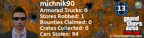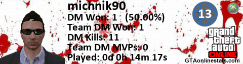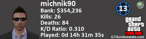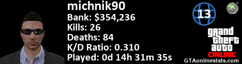 [URL=http://GTAonlinestats.com/showplayer/michnik90][IMG]http://GTAonlinestats.com/signature/michnik90/sig.png[/IMG][/URL]