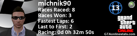 <a href="http://GTAonlinestats.com/showplayer/michnik90"><img src="http://GTAonlinestats.com/racesignature/michnik90/sig.png" alt="michnik90" border="0" /></a>
