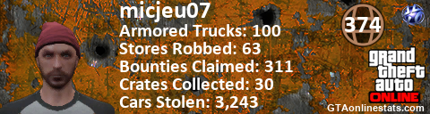 [URL=http://GTAonlinestats.com/showplayer/micjeu07][IMG]http://GTAonlinestats.com/crimesignature/micjeu07/sig.png[/IMG][/URL]