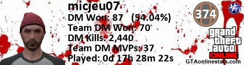 [URL=http://GTAonlinestats.com/showplayer/micjeu07][IMG]http://GTAonlinestats.com/signature/micjeu07/sig.png[/IMG][/URL]