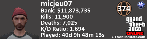 <a href="http://GTAonlinestats.com/showplayer/micjeu07"><img src="http://GTAonlinestats.com/signature/micjeu07/sig.png" alt="micjeu07" border="0" /></a>