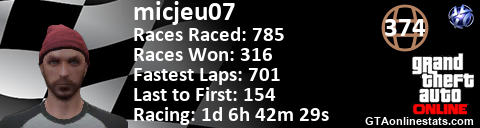 <a href="http://GTAonlinestats.com/showplayer/micjeu07"><img src="http://GTAonlinestats.com/racesignature/micjeu07/sig.png" alt="micjeu07" border="0" /></a>