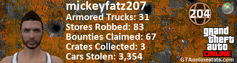 [URL=http://GTAonlinestats.com/showplayer/mickeyfatz207][IMG]http://GTAonlinestats.com/crimesignature/mickeyfatz207/sig.png[/IMG][/URL]