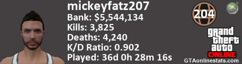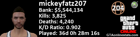 <a href="http://GTAonlinestats.com/showplayer/mickeyfatz207"><img src="http://GTAonlinestats.com/dmsignature/mickeyfatz207/sig.png" alt="mickeyfatz207" border="0" /></a>