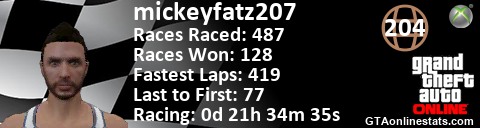 <a href="http://GTAonlinestats.com/showplayer/mickeyfatz207"><img src="http://GTAonlinestats.com/racesignature/mickeyfatz207/sig.png" alt="mickeyfatz207" border="0" /></a>