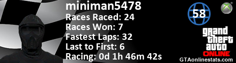 <a href="http://GTAonlinestats.com/showplayer/miniman5478"><img src="http://GTAonlinestats.com/racesignature/miniman5478/sig.png" alt="miniman5478" border="0" /></a>