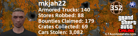<a href="http://GTAonlinestats.com/showplayer/mkjah22"><img src="http://GTAonlinestats.com/randomsignature/mkjah22/sig.png" alt="mkjah22" border="0" /></a>