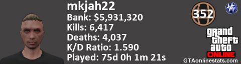 <a href="http://GTAonlinestats.com/showplayer/mkjah22"><img src="http://GTAonlinestats.com/signature/mkjah22/sig.png" alt="mkjah22" border="0" /></a>