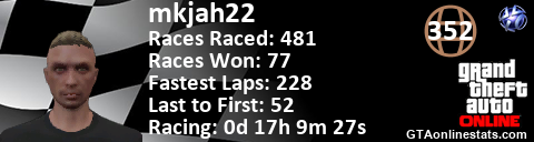 <a href="http://GTAonlinestats.com/showplayer/mkjah22"><img src="http://GTAonlinestats.com/racesignature/mkjah22/sig.png" alt="mkjah22" border="0" /></a>