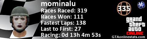 <a href="http://GTAonlinestats.com/showplayer/mominalu"><img src="http://GTAonlinestats.com/racesignature/mominalu/sig.png" alt="mominalu" border="0" /></a>