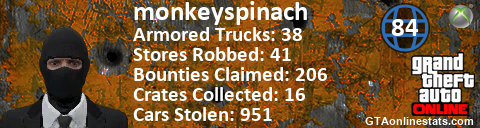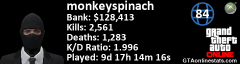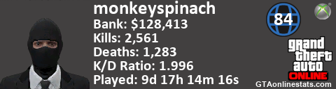 <a href="http://GTAonlinestats.com/showplayer/monkeyspinach"><img src="http://GTAonlinestats.com/signature/monkeyspinach/sig.png" alt="monkeyspinach" border="0" /></a>