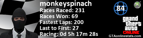 <a href="http://GTAonlinestats.com/showplayer/monkeyspinach"><img src="http://GTAonlinestats.com/racesignature/monkeyspinach/sig.png" alt="monkeyspinach" border="0" /></a>