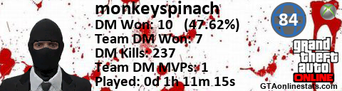 <a href="http://GTAonlinestats.com/showplayer/monkeyspinach"><img src="http://GTAonlinestats.com/dmsignature/monkeyspinach/sig.png" alt="monkeyspinach" border="0" /></a>