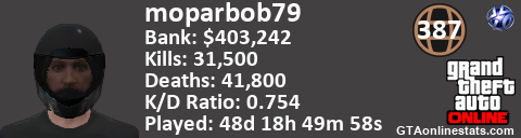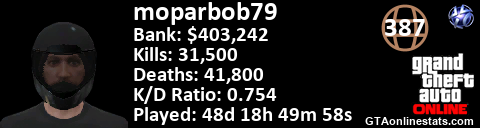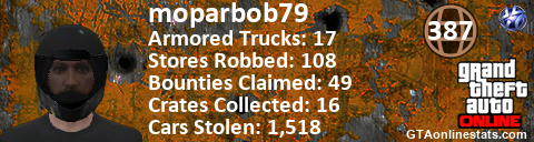 [URL=http://GTAonlinestats.com/showplayer/moparbob79][IMG]http://GTAonlinestats.com/signature/moparbob79/sig.png[/IMG][/URL]