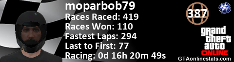 <a href="http://GTAonlinestats.com/showplayer/moparbob79"><img src="http://GTAonlinestats.com/racesignature/moparbob79/sig.png" alt="moparbob79" border="0" /></a>