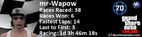 <a href="http://GTAonlinestats.com/showplayer/mr-Wapow"><img src="http://GTAonlinestats.com/racesignature/mr-Wapow/sig.png" alt="mr-Wapow" border="0" /></a>