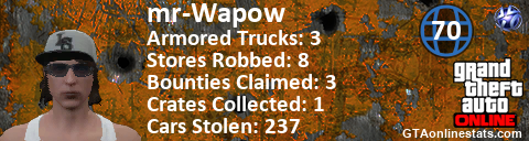 <a href="http://GTAonlinestats.com/showplayer/mr-Wapow"><img src="http://GTAonlinestats.com/crimesignature/mr-Wapow/sig.png" alt="mr-Wapow" border="0" /></a>