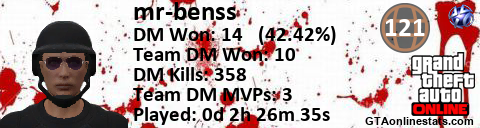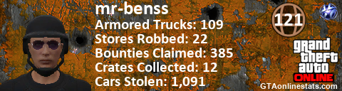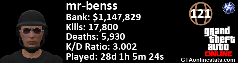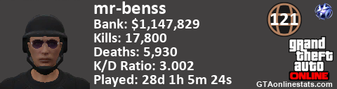 <a href="http://GTAonlinestats.com/showplayer/mr-benss"><img src="http://GTAonlinestats.com/randomsignature/mr-benss/sig.png" alt="Mr-benss" border="0" /></a>