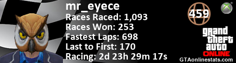 <a href="http://GTAonlinestats.com/showplayer/mr_eyece"><img src="http://GTAonlinestats.com/racesignature/mr_eyece/sig.png" alt="Mr_eYeCe" border="0" /></a>