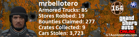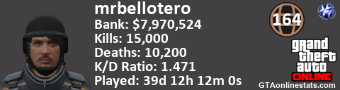 <a href="http://GTAonlinestats.com/showplayer/mrbellotero"><img src="http://GTAonlinestats.com/signature/mrbellotero/sig.png" alt="mrbellotero" border="0" /></a>
