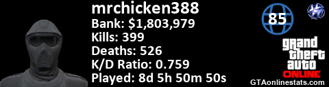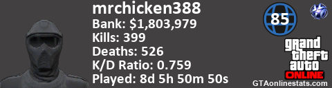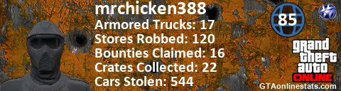 <a href="http://GTAonlinestats.com/showplayer/mrchicken388"><img src="http://GTAonlinestats.com/signature/mrchicken388/sig.png" alt="mrchicken388" border="0" /></a>