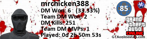 <a href="http://GTAonlinestats.com/showplayer/mrchicken388"><img src="http://GTAonlinestats.com/dmsignature/mrchicken388/sig.png" alt="mrchicken388" border="0" /></a>