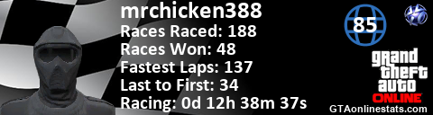 <a href="http://GTAonlinestats.com/showplayer/mrchicken388"><img src="http://GTAonlinestats.com/racesignature/mrchicken388/sig.png" alt="mrchicken388" border="0" /></a>