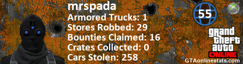 [URL=http://GTAonlinestats.com/showplayer/mrspada][IMG]http://GTAonlinestats.com/crimesignature/mrspada/sig.png[/IMG][/URL]