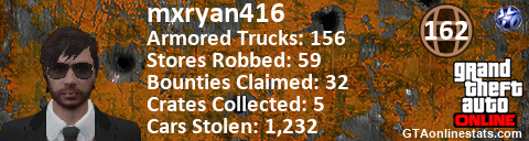 <a href="http://GTAonlinestats.com/showplayer/mxryan416"><img src="http://GTAonlinestats.com/crimesignature/mxryan416/sig.png" alt="mxryan416" border="0" /></a>