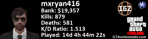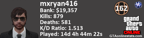 <a href="http://GTAonlinestats.com/showplayer/mxryan416"><img src="http://GTAonlinestats.com/randomsignature/mxryan416/sig.png" alt="mxryan416" border="0" /></a>