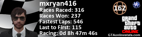 <a href="http://GTAonlinestats.com/showplayer/mxryan416"><img src="http://GTAonlinestats.com/racesignature/mxryan416/sig.png" alt="mxryan416" border="0" /></a>