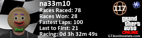 <a href="http://GTAonlinestats.com/showplayer/na33m10"><img src="http://GTAonlinestats.com/racesignature/na33m10/sig.png" alt="na33m10" border="0" /></a>