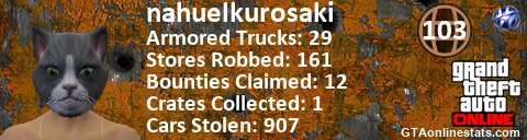 [URL=http://GTAonlinestats.com/showplayer/nahuelkurosaki][IMG]http://GTAonlinestats.com/crimesignature/nahuelkurosaki/sig.png[/IMG][/URL]