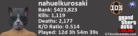 [URL=http://GTAonlinestats.com/showplayer/nahuelkurosaki][IMG]http://GTAonlinestats.com/dmsignature/nahuelkurosaki/sig.png[/IMG][/URL]