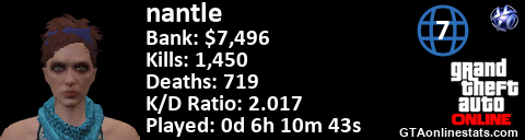<a href="http://GTAonlinestats.com/showplayer/nantle/2"><img src="http://GTAonlinestats.com/dmsignature/nantle/2/sig.png" alt="nantle" border="0" /></a>