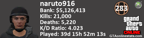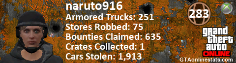 [URL=http://GTAonlinestats.com/showplayer/naruto916][IMG]http://GTAonlinestats.com/signature/naruto916/sig.png[/IMG][/URL]