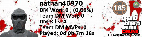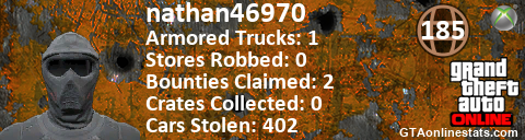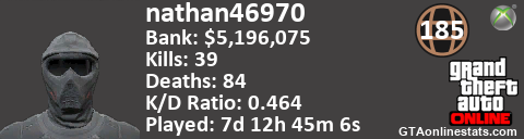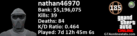 <a href="http://GTAonlinestats.com/showplayer/nathan46970"><img src="http://GTAonlinestats.com/signature/nathan46970/sig.png" alt="nathan46970" border="0" /></a>