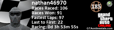 <a href="http://GTAonlinestats.com/showplayer/nathan46970"><img src="http://GTAonlinestats.com/racesignature/nathan46970/sig.png" alt="nathan46970" border="0" /></a>