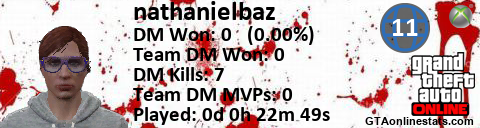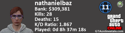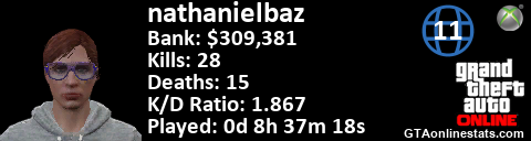 [URL=http://GTAonlinestats.com/showplayer/nathanielbaz][IMG]http://GTAonlinestats.com/signature/nathanielbaz/sig.png[/IMG][/URL]