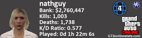 [URL=http://GTAonlinestats.com/showplayer/nathguy/2][IMG]http://GTAonlinestats.com/signature/nathguy/2/sig.png[/IMG][/URL]