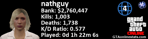 <a href="http://GTAonlinestats.com/showplayer/nathguy/2"><img src="http://GTAonlinestats.com/dmsignature/nathguy/2/sig.png" alt="nathguy" border="0" /></a>