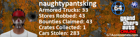 [URL=http://GTAonlinestats.com/showplayer/naughtypantsking][IMG]http://GTAonlinestats.com/crimesignature/naughtypantsking/sig.png[/IMG][/URL]