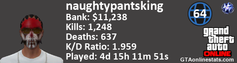 [URL=http://GTAonlinestats.com/showplayer/naughtypantsking][IMG]http://GTAonlinestats.com/signature/naughtypantsking/sig.png[/IMG][/URL]