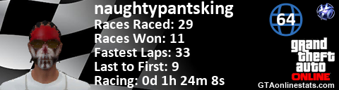 [URL=http://GTAonlinestats.com/showplayer/naughtypantsking][IMG]http://GTAonlinestats.com/racesignature/naughtypantsking/sig.png[/IMG][/URL]