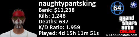 <a href="http://GTAonlinestats.com/showplayer/naughtypantsking"><img src="http://GTAonlinestats.com/signature/naughtypantsking/sig.png" alt="naughtypantsking" border="0" /></a>