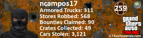 <a href="http://GTAonlinestats.com/showplayer/ncampos17"><img src="http://GTAonlinestats.com/randomsignature/ncampos17/sig.png" alt="ncampos17" border="0" /></a>